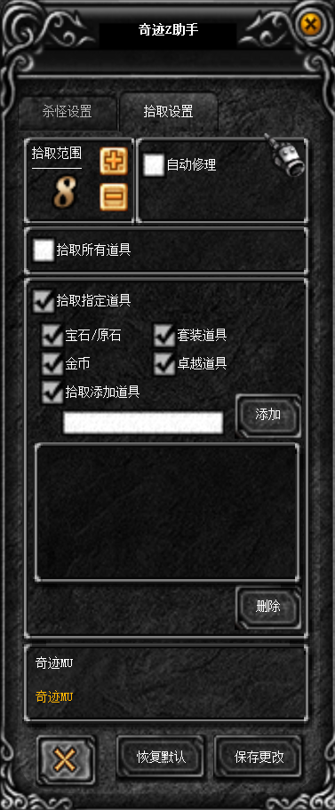 Z助手官方助手,战士挂机连击方便,智能加攻防状态,拾取只需一个字即可触发,例如拾取龙王装备,只需写龙王,他会自动识别龙王全套手鞋子头盔护腿铠甲。